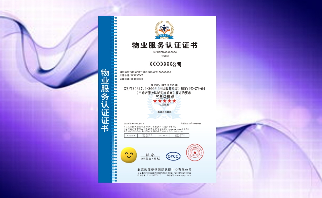 物业服务认证证书是对物业服务企业的服务质量、管理水平等多方面进行综合评估后给予的认证。它就像是物业服务界的 “荣誉勋章”,有了它,业主会更信任你们的服务,公司在市场上也能脱颖而出。